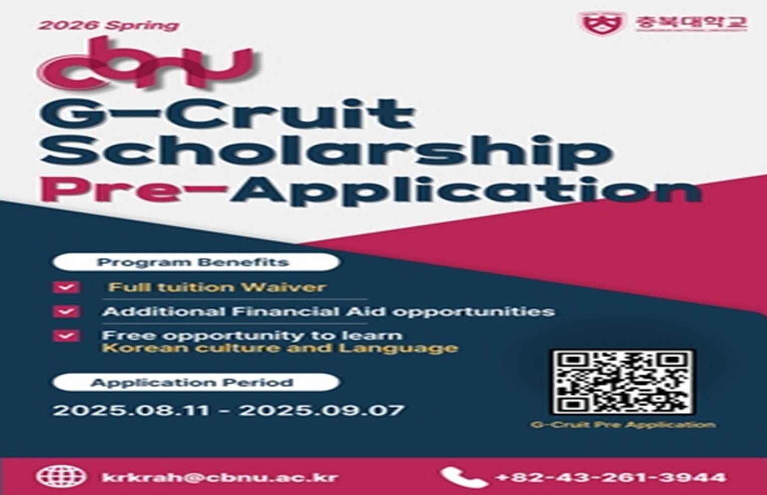 Chungbuk Üniversitesi, Kore’nin önde gelen ulusal üniversitelerinden biridir. 2027’de Kore Ulaştırma Üniversitesi ile birleşerek “Ulusal Temsilci Üniversite” olarak büyümeyi hedeflemektedir. Araştırma odaklı eğitim anlayışına dayalı olarak dünya çapında yetenekli insanları bünyesine katmayı amaçlamaktadır.