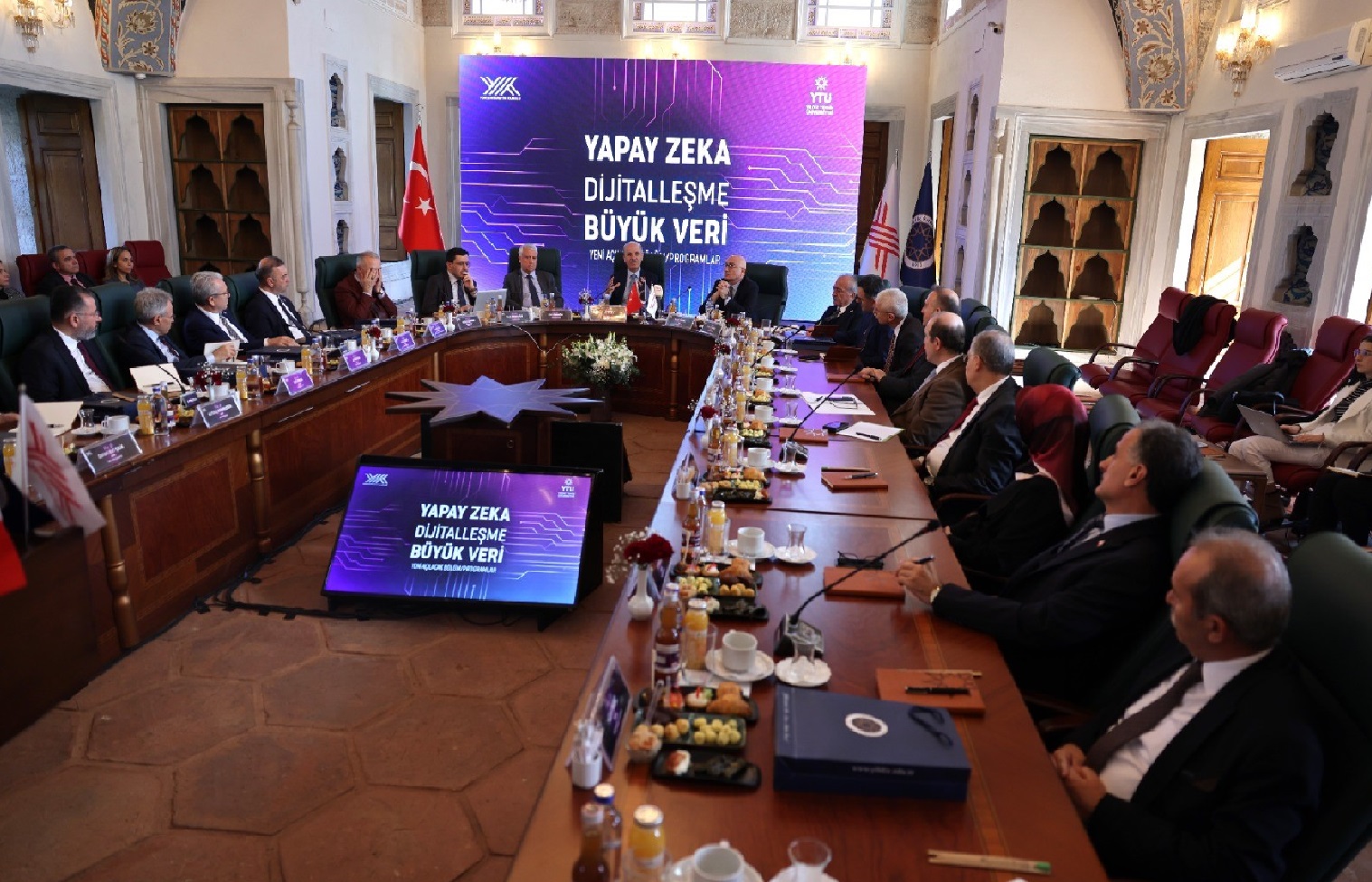 Yıldız Teknik Üniversitesi Otağ-ı Hümayun’da düzenlenen “Yapay Zeka, Dijitalleşme ve Büyük Veri” toplantısına Yükseköğretim Kurulu (YÖK) Başkanı Prof. Dr. Erol Özvar, Yükseköğretim Yürütme Kurulu Üyeleri Prof. Dr. Naci Gündoğan ve Prof. Dr. Hüseyin Karaman, Karabük Üniversitesi Rektörü Prof. Dr. Fatih Kırışık ile yeni program ve bölümlerin açılacağı üniversite rektörleri katıldı.