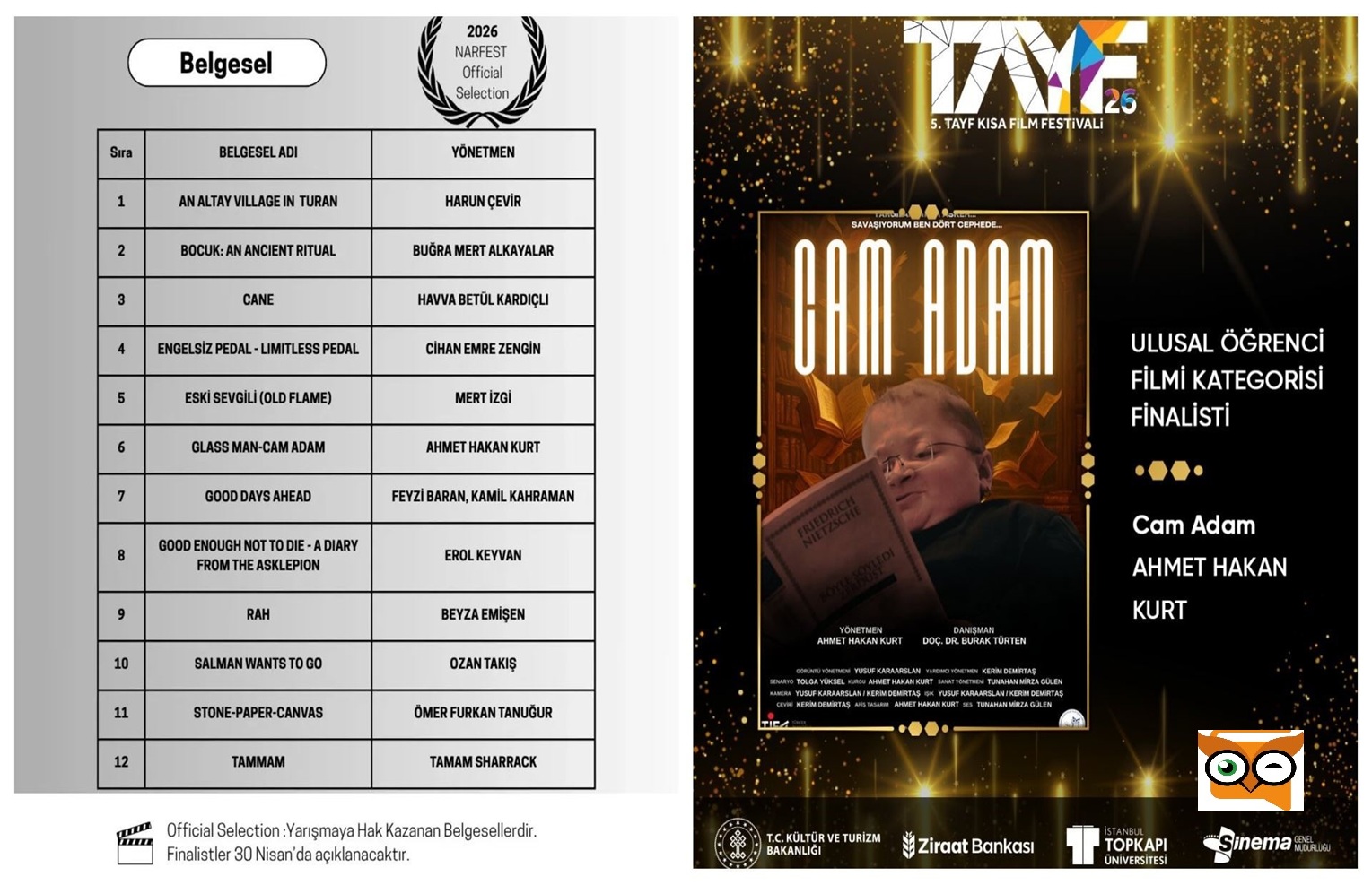 Radyo, Televizyon ve Sinema Bölümü 4. sınıf öğrencileri tarafından hazırlanan belgesel, TAYF Kısa Film Festivali ve Narfest Kısa Film Festivali’nde finale kalarak çifte başarı elde etti.
