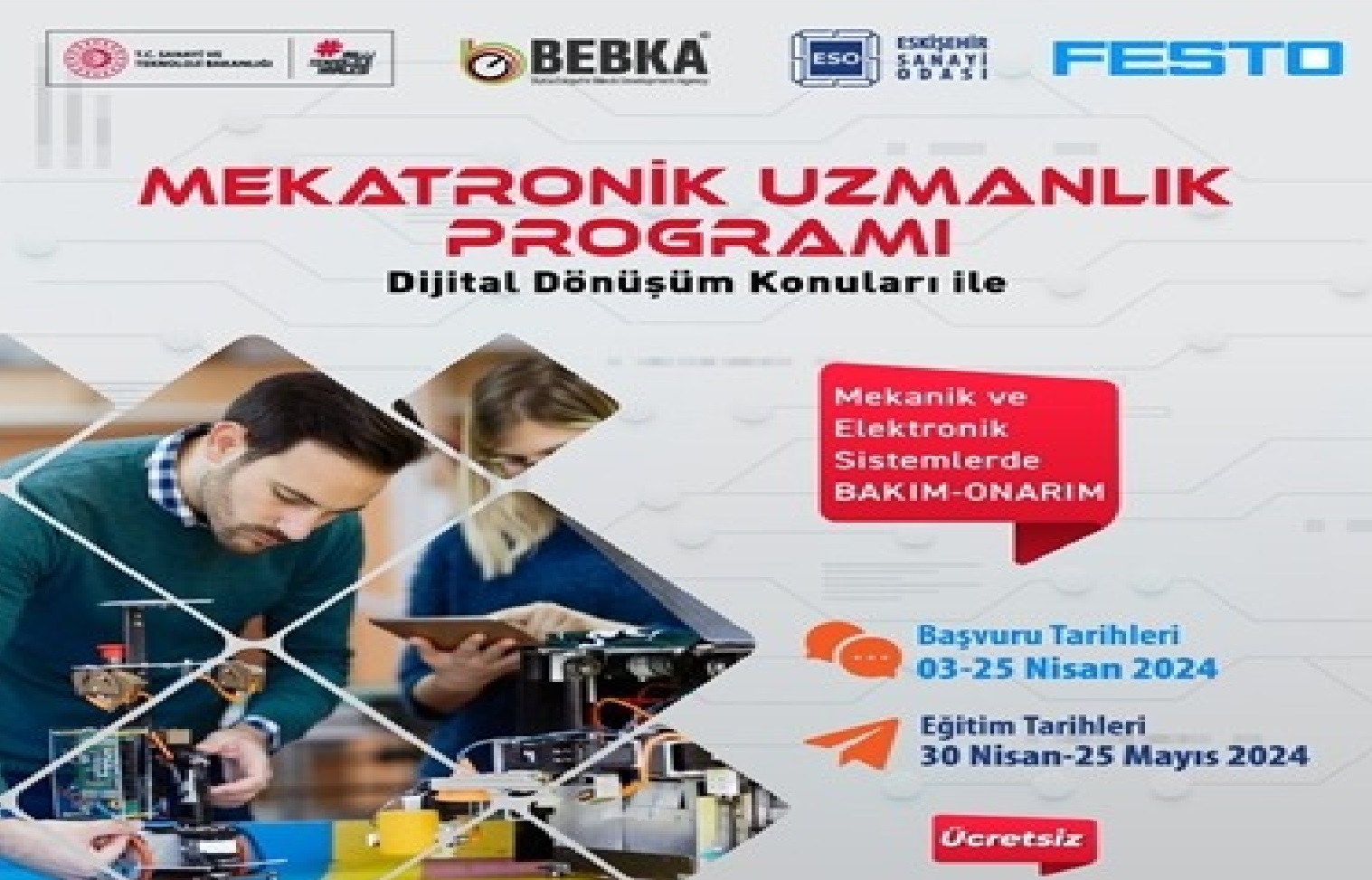 Bursa Eskişehir Bilecik Kalkınma Ajansı (BEBKA)’nın destekleriyle, Eskişehir Sanayi Odası ve Festo firması iş birliğinde Mekatronik Uzmanlık Programı gerçekleştirilecektir. Dijital dönüşüm konularıyla mekanik ve elektronik sistemlerde bakım ve onarım temelli eğitimlerin verileceği program için son başvuru tarihi 25 Nisan 2024’tür.