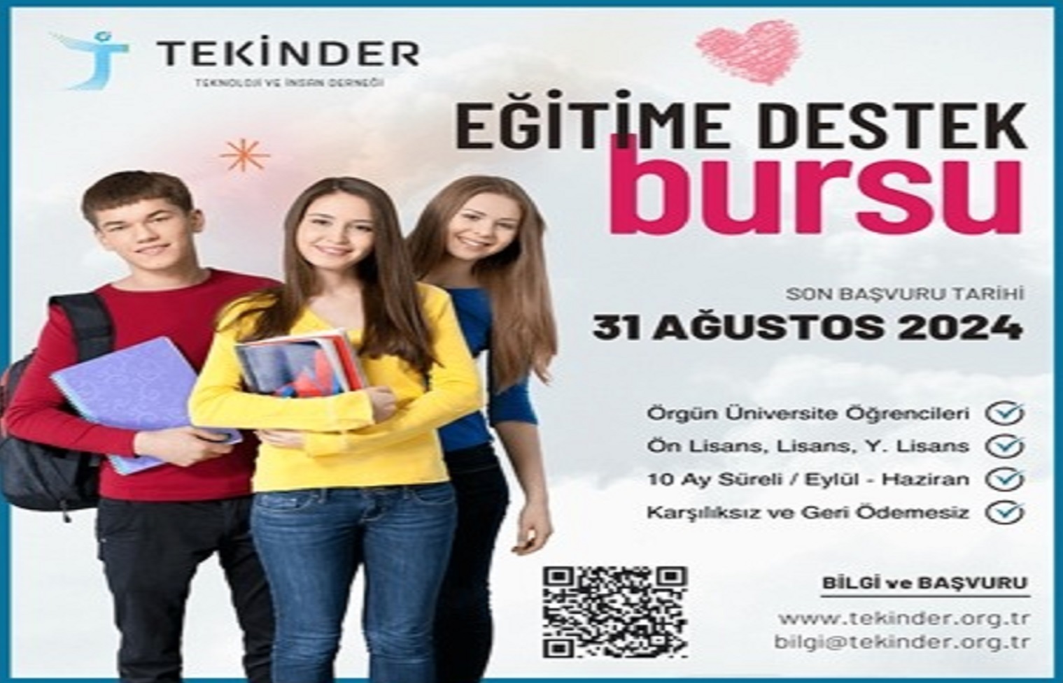 Teknoloji ve İnsan Derneği, 2024-2025 Eğitim ve Öğretim yılında üniversitelerin ilgili bölümlerinde öğrenim gören öğrencilerin eğitim ve yaşam giderlerine destek amacıyla, Eylül 2024 – Haziran 2025 tarihleri arasında toplam 10 ay süreyle “Karşılıksız/Geri Ödemesiz” burs verecektir.