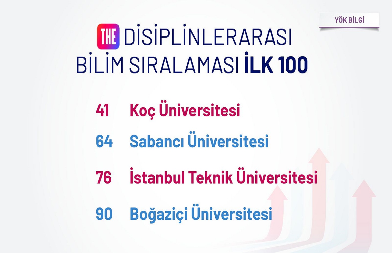 Times Higher Education (THE) Disiplinlerarası Bilim Sıralamalarında ilk 200’de 10 ilk 100’de 4 Türk üniversitesi yer aldı. Türkiye, Times Higher Education (THE) Disiplinlerarası Bilim Sıralamalarında sıralamaya giren üniversite sayısına göre dünya ikincisi oldu. Sıralamada ilk 100’de Koç Üniversitesi (41), Sabancı Üniversitesi (64), İstanbul Teknik Üniversitesi (76) ve Boğaziçi Üniversitesi (90) yer aldılar.